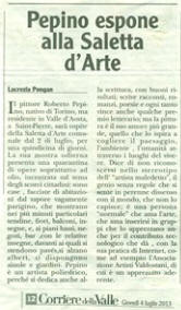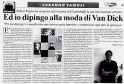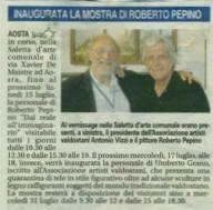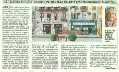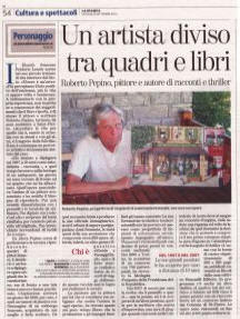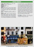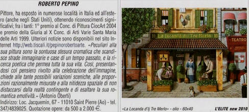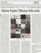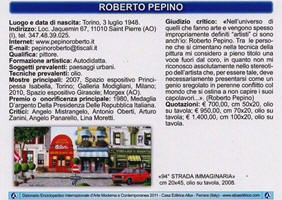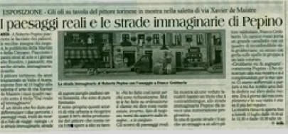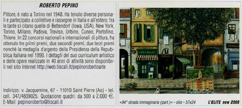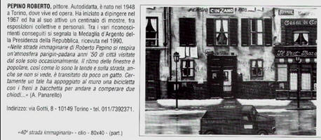 Antonio Oberti Peculiare alla pittura di Roberto Pepino sono la sontuosa stesura cromatica che scandisce strade e case immaginarie, lo studio delle luci e delle ombre che determinano la profondità e la ricerca poetica che permea tutta la sua vita. L'itinerario conoscitivo di Roberto Pepino si snoda anche lungo un personale registro iperrealistico per evidenziare, con forme levigate, un universo equilibrato e perfetto, dove ciascuno può immergersi a piacimento in quello che e' lo studio esasperato del vero, fino a creare effetti di illusionismo ottico. La perfetta costruzione degli interni, la stesura cromatica efficacemente realizzata, l'incidenza dei giochi delle ombre ed il calcolato dispiegarsi dei volumi permettono allo spettatore di immergersi in un'atmosfera di lirica suggestione. A completare il mondo delle idee dell'artista torinese assume una propria evidenza l'assemblaggio di volti, figure storiche, ritagli di giornali, scritte e spazi atmosferici costituenti una impostazione pittorico-espressiva tematica composta da piccoli dipinti su tavola che, uniti gli uni agli altri, tendono a formare un unico quadro omogeneo ed autonomo Gianluigi Amerio Roberto Pepino propone momenti artistici caratterizzati da un' univocità formale di indubbia personalità. Pittura curata, ben rispondente ai dettami di tale caratterizzante struttura lessicale, ove il pittore trova un suo preciso spazio dialettico. Ne va sottolineato il sapiente uso e dosaggio del colore sì da determinare un' autoctona ed incisiva maestria discorsiva Angelo Panarello Nelle "strade immaginarie di Roberto Pepino si respira un'atmosfera parigin-padana anni 50 di città visitate dal sole solo occasionalmente. Il ritmo delle finestre e' popolare così come lo sono le tende; sulla strada, anche se non si vede, e' transitato da poco un gatto, certamente un tale ha appoggiato al muro una vecchia bicicletta con i freni a bacchetta (in questa via non sono mai transitati altro che bici e carretti) per andare a comperare due chiodi. Magici sono questi marciapiedi così vissuti e saturi di pisciatine, ectoplasmi fecali di cani e gatti, sporcizia negli angoli ed atti di veniale imbrattamento dei muri. Arturo Zanini Quando ci si ferma davanti ad una "strada immaginaria" di Roberto Pepino il dipinto si trasforma improvvisamente in un libro che invita ad essere sfogliato lentamente e poi riletto per scoprirne i deliziosi piccoli particolari, nascosti tra le righe, che inevitabilmente sfuggirebbero ad una prima rapida lettura. L. Moretti "L’infrangimento della precarietà del piano bidimensionale....", "l’esistenza in nuce di un territorio pittorico destinato a risalire i livelli semantici....", "il senso di spaesamento che però non angoscia ne inquieta....," come si legge nelle varie recensioni, saranno forse cose vere, ma poco si addicono al carattere di Roberto Pepino: lui è semplice, immediato, diretto. Le espressioni paludate, eccessive, sontuose, non si confanno alla sua indole schietta. L’artista, di fronte all’universo dell’arte, si sente come un novello fanciullo pascoliano dove la passione per la buona pittura si impadronisce delle sue ore di sonno e lo tiene sveglio e coinvolto nell’espressione unica, tutta sua, fatta di una precisione tecnica di elevato livello. Il gusto per l’insieme non spreca il particolare, anzi lo esalta. Per Pepino l’arte è gioia e dipingere è un piacere. Redazione TISCALI Una adesione convinta al realismo genera paradossalmente soluzioni al limite del reale: irreali silenzi, assenze sospette, gli effetti moltiplicatori del gioco di ricerca del quadro nel quadro, sia che si guardi dentro una cornice sia che si guardi fuori da una finestra, ricreano una realtà che ha il sapore della fantasia, in qualche modo lontana dallo spazio e dal tempo familiari. Articoli e Citazioni 011 Racconta, Arte Mondadori, Corriere dell'arte, Corriere di Torino e della Provincia, Comunità, Gazzeta Matin, Il Corriere della Valle, Il Corriere di Grugliasco, Il Gazzettino, Il Rinnovamento, La Città, La Gazzetta di Treviso, La Gazzetta di Saluzzo, La Stampa, La Tribuna di Teviso, La Vallèe Notizie, L'Eco del Chisone, Luna Nuova, Melange, Percorsi d'Arte, Stampa Sera, TorinoSette.
